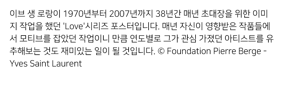 이브 생 로랑이 1970년부터 2007년까지 38년간 매년 자신의 콜렉션 초대장을 위한 이미지로 작업을 했던 'Love'시리즈 포스터입니다. 매년 자신이 영향받은 작품들에서 모티브를 잡았던 작업이니 만큼 연도별로 그가 관심 가졌던 아티스트를 유추해보는 것도 재미있는 일이 될 것입니다. © Foundation Pierre Berge - Yves Saint Laurent