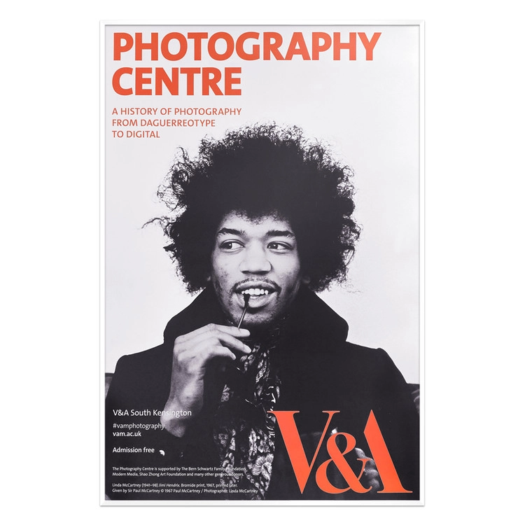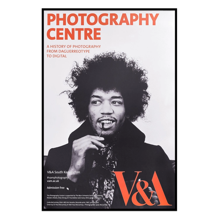 2018년 새로 오픈한 South Kensington 소재의 V&A 뮤지엄 Photography Centre 전시 포스터 입니다. 포스터에는 최고의 기타리스트로 꼽히는 뮤지션 Jimi Hendrix의 모습을 담은 Linda McCartney, US(1941-1998)의 작품이 포함되어 있습니다. © 1967 Paul McCartney / Photographer : Linda McCartney