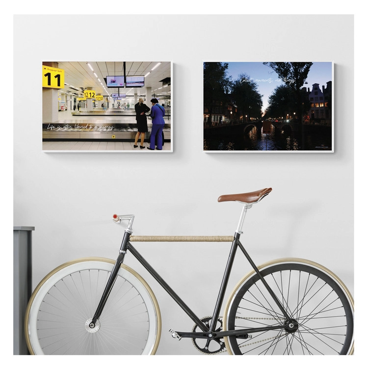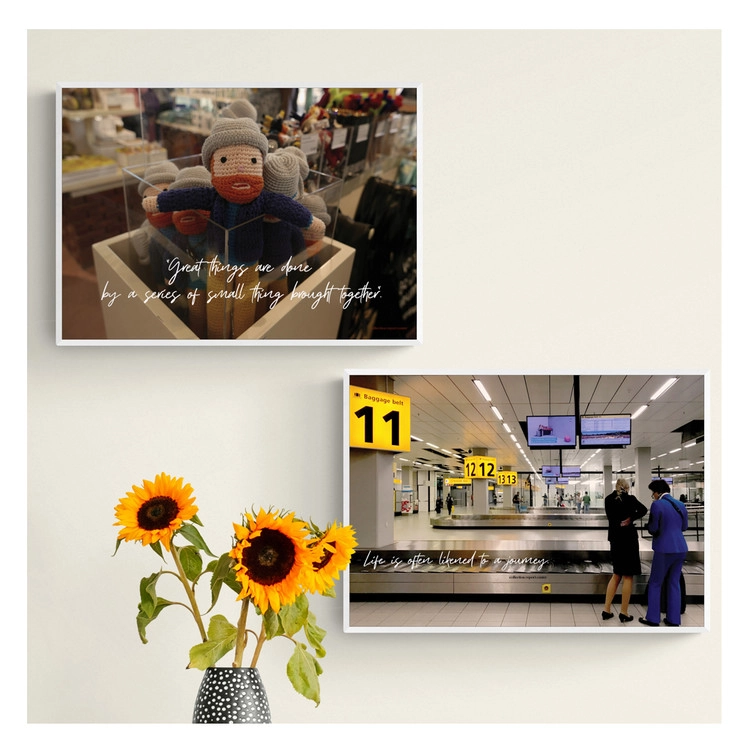 암스테르담에서 마주친 순간을 담은 포스터입니다. 인생은 흔히 여행에 비유된다는 라는 문구가 담긴 공항의 모습과 운하의 낮과 밤의 모습, 암스테르담 하면 떠오르는 작은 반고흐 인형, 기억하고 싶은 암스테르담의 풍경과 문구를 함께 담아 보았어요. 여행의 추억과 행복한 일상의 여행을 위해.