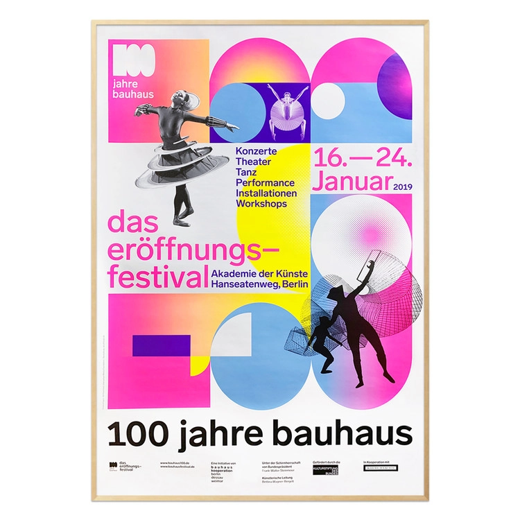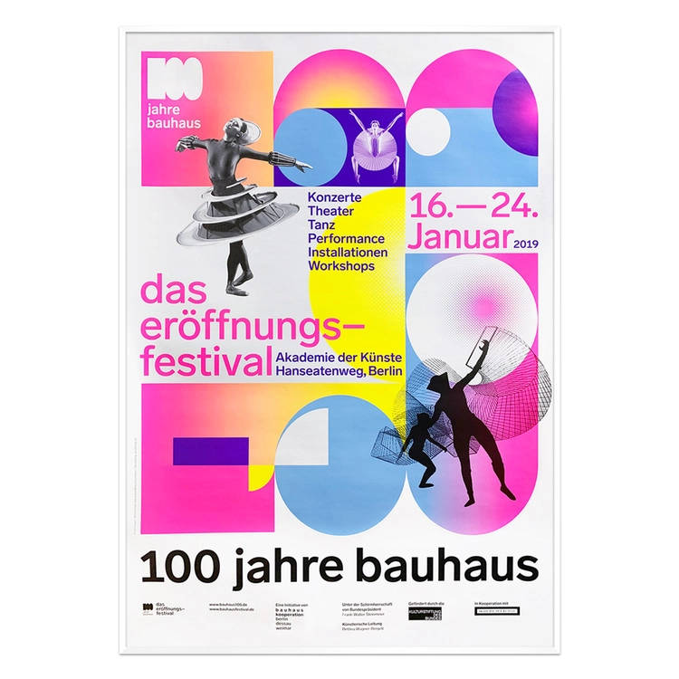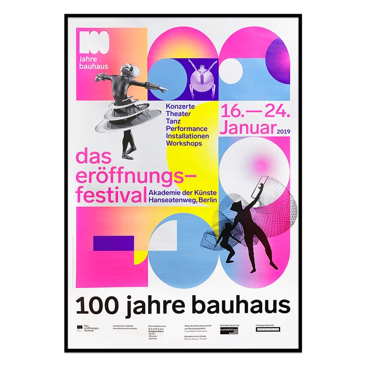 바우하우스 100주년인 2019년 첫번째 행사로 진행된 오프닝 페스티벌을 위해 발행된 포스터입니다. 이 페스티벌은 2019년 1월 16일에서 24일까지 Berlin Academy of Arts(베를린 예술원)에서 진행됐습니다. 바우하우스 창단 100주년을 맞은 2019년 전국적인 축제의 서막이었다. 전세계에서 수많은 예술가를 베를린에서 바우하우스의 뛰어난 역사적 의미 뿐만 아니라 우리의 현재와 미래를 위한 탐구를 발표하는 축제입니다.