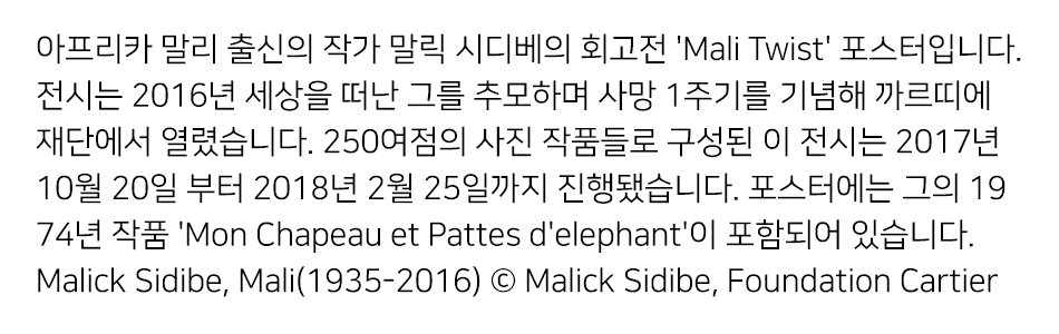 아프리카 말리 출신의 작가 말릭 시디베의 회고전 'Mali Twist' 포스터입니다. 전시는 2016년 세상을 떠난 그를 추모하며 사망 1주기를 기념해 까르띠에 재단에서 열렸습니다. 250여점의 사진 작품들로 구성된 이 전시는 2017년 10월 20일 부터 2018년 2월 25일까지 진행됐습니다. 포스터에는 그의 1974년 작품 'Mon Chapeau et Pattes d'elephant'이 포함되어 있습니다. Malick Sidibe, Mali(1935-2016) © Malick Sidibe, Foundation Cartier